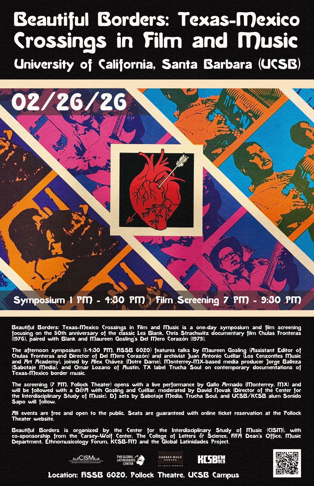 Beautiful Borders: Texas-Mexico Crossings in Film and Music is a one-day symposium and film screening focusing on the unique role of music in Texas-Mexico border culture, to be held on February 26, 2026 on the campus of the University of California, Santa Barbara. The event is centered in a public screening of the 50th anniversary 4K restoration of the Les Blank/Chris Strachwitz film Chulas Fronteras (1976), paired with Del Mero Corazón (1979) at the Pollock Theater. The screening will be followed with a Q&A with Maureen Gosling (Assistant Editor of Chulas Fronteras and Director of Del Mero Corazón) and Juan Antonio Cuéllar (Archivist at Los Cenzontles Music and Art Academy), moderated by David Novak (Director of the Center for the Interdisciplinary Study of Music). The film screening is preceded by an afternoon symposium during which Gosling and Cuéllar will be joined by Alex Chávez (musician/ anthropologist at Notre Dame and author of the award-winning book Sounds of Crossing), as well as a joint presentation by Monterrey-MX-based archivist and media producer Jorge Balleza of Sabotaje Media with Omar Lozano of Austin, TX label Trucha Soul on contemporary documentations of Texas-Mexico border music. The screening will be preceded by a performance of corridos by Gallo Armado (Monterrey, MX), with DJ sets by Balleza, Lozano and UCSB/KCSB alum Eduardo Camacho (Sonido Sapo) before and after the film screening. All events are free and open to the public. Seats are guaranteed with online ticket reservation at the Pollock Theater website.