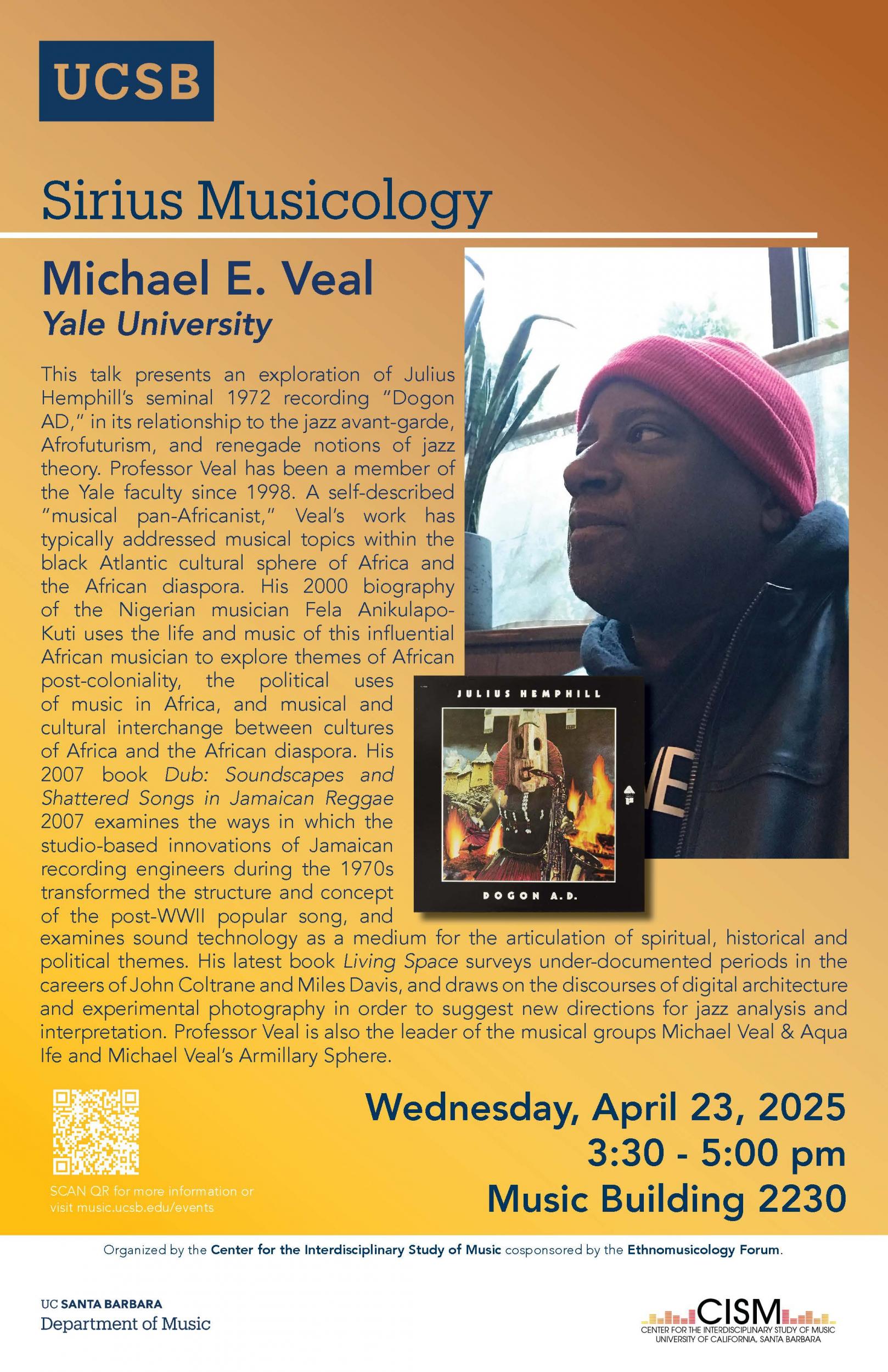 This talk presents an exploration of Julius Hemphill’s seminal 1972 recording “Dogon AD,” in its relationship to the jazz avant-garde, Afrofuturism, and renegade notions of jazz theory. Professor Veal has been a member of the Yale faculty since 1998. A self-described “musical pan-Africanist,” Veal’s work has typically addressed musical topics within the black Atlantic cultural sphere of Africa and the African diaspora. His 2000 biography of the Nigerian musician Fela Anikulapo-Kuti uses the life and music of this influential African musician to explore themes of African post-coloniality, the political uses of music in Africa, and musical and cultural interchange between cultures of Africa and the African diaspora. His 2007 book Dub: Soundscapes and Shattered Songs in Jamaican Reggae 2007 examines the ways in which the studio-based innovations of Jamaican recording engineers during the 1970s transformed the structure and concept of the post-WWII popular song, and examines sound technology as a medium for the articulation of spiritual, historical and political themes. His latest book Living Space surveys under-documented periods in the careers of John Coltrane and Miles Davis, and draws on the discourses of digital architecture and experimental photography in order to suggest new directions for jazz analysis and interpretation. Professor Veal is also the leader of the musical groups Michael Veal & Aqua Ife and Michael Veal’s Armillary Sphere.
